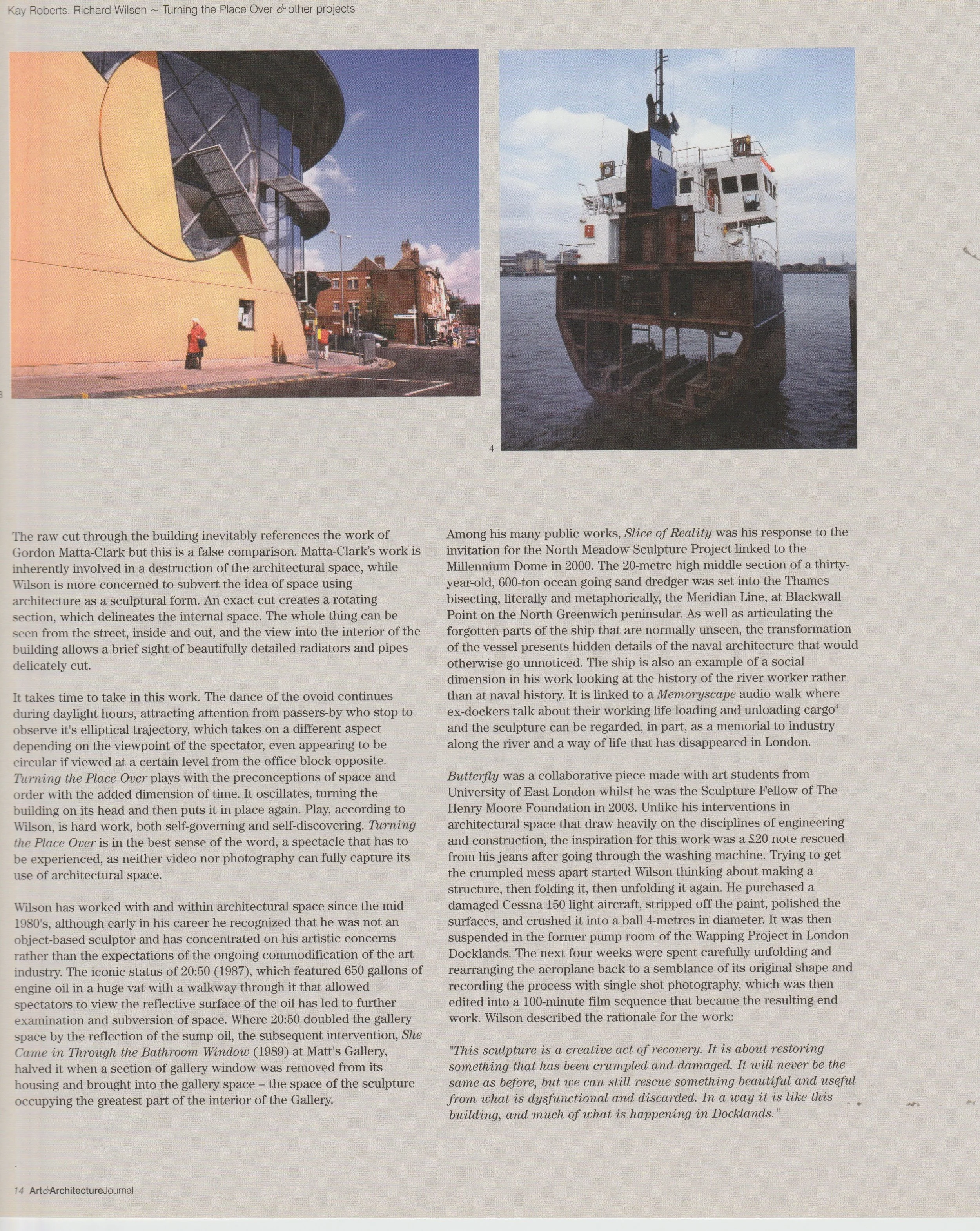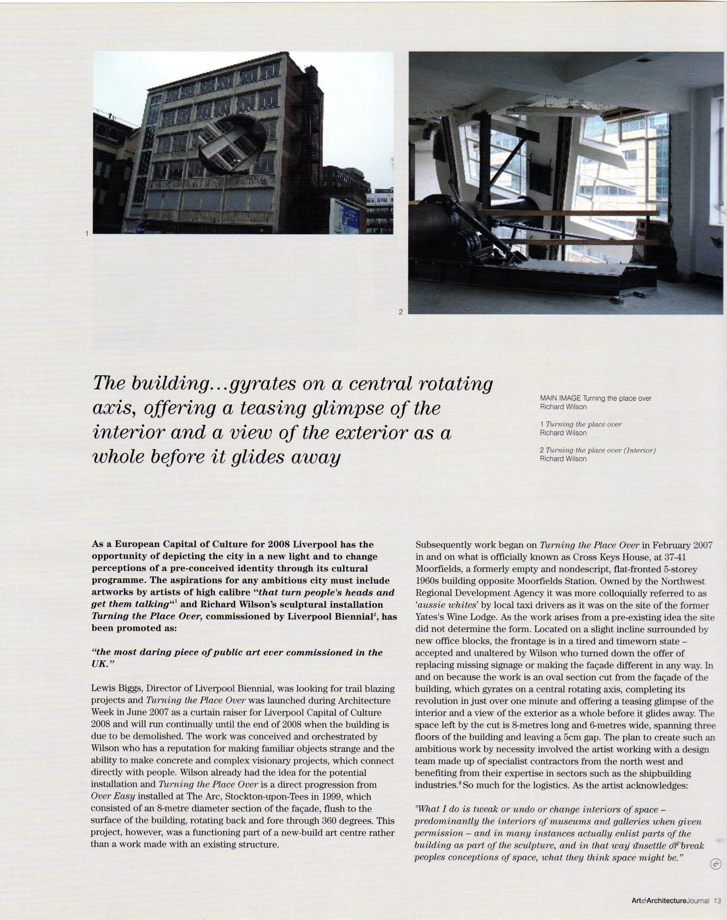 As a European Capital of Culture for 2008 Liverpool has the opportunity of depicting the city in a new light and to change perceptions of a pre-conceived identity through its cultural programme. The aspirations for any ambitious city must include artworks by artists of high calibre “that turn peoples heads and get them talking* and Richard Wilson’s sculptural installation Turning the Place Over, commissioned by Liverpool Biennale, **has been promoted as:
